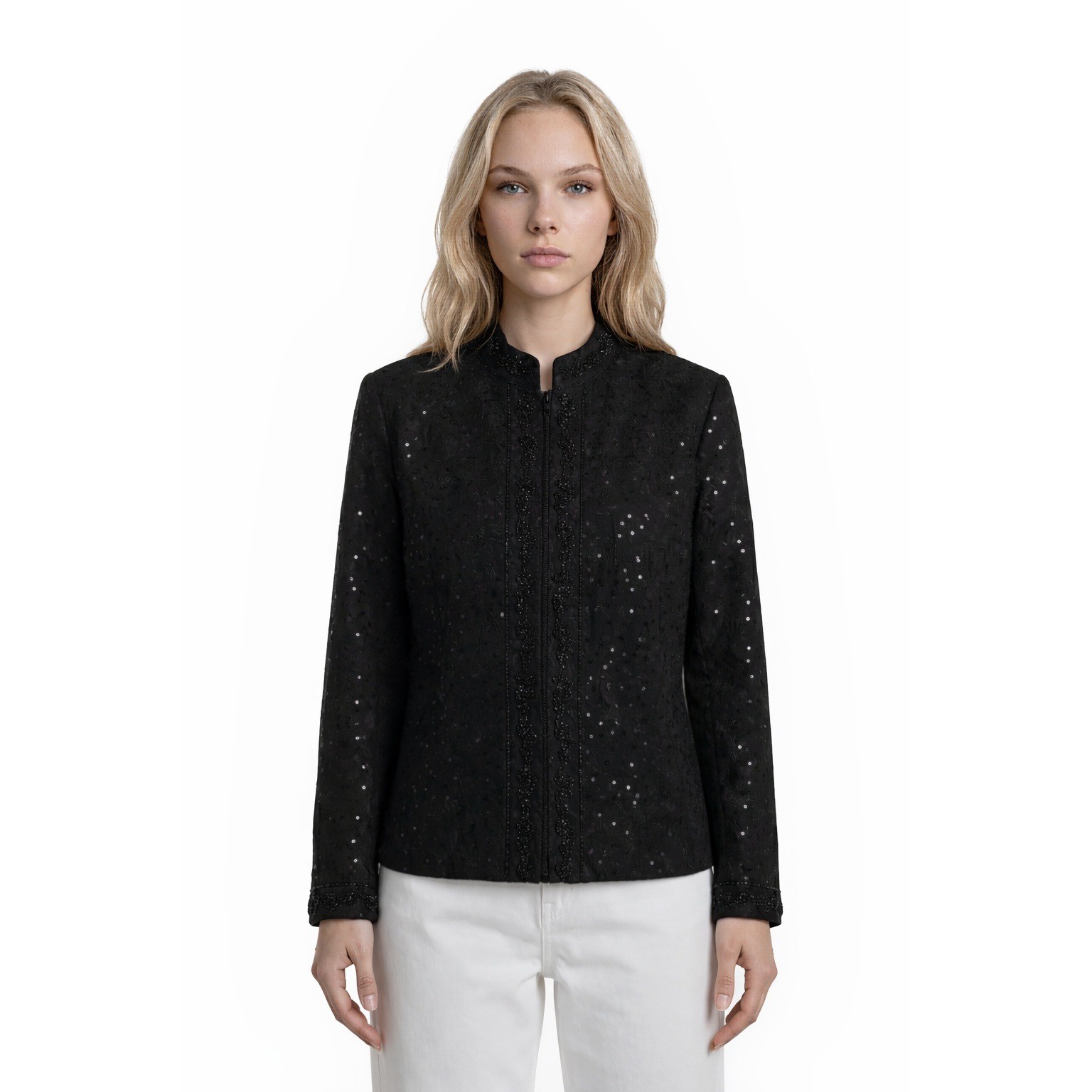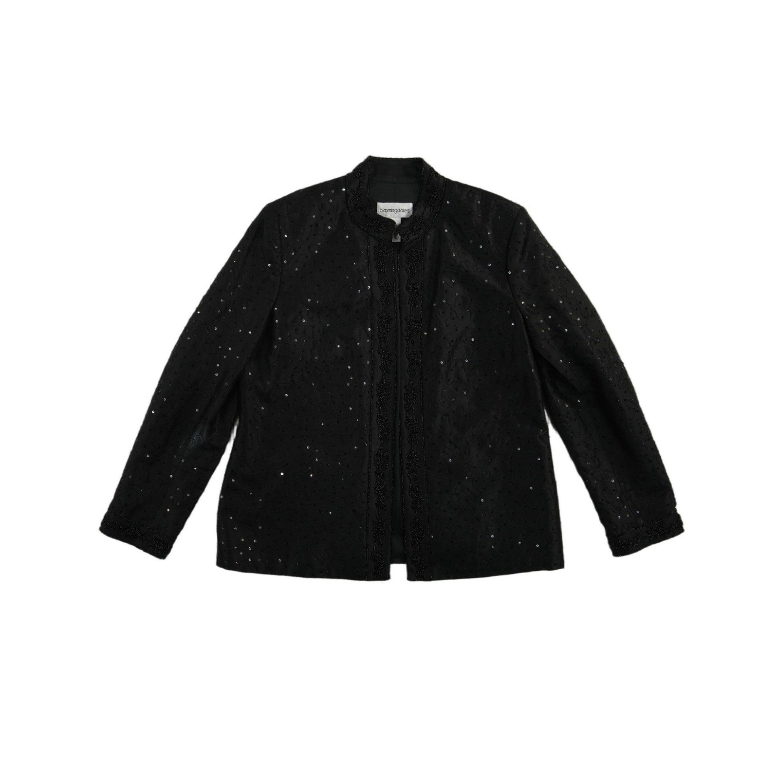 Excellent Condition! Bloomingdale's evening jacket crafted from a luxurious silk and wool blend, featuring intricate beadwork and sequin embellishments throughout. This elegant piece is designed with a sophisticated mandarin collar and a zip-front closure, accented by ornate floral beaded trim along the placket, collar, and cuffs. The black fabric is further detailed with subtle swirl embroidery and shimmering sequins, making it an ideal choice for formal occasions or holiday events. Fully lined with smooth acetate for a comfortable fit.