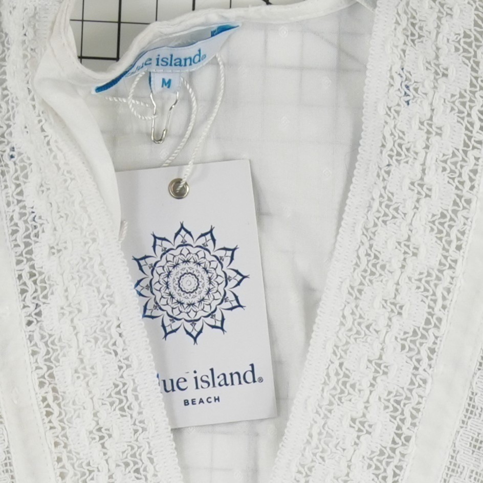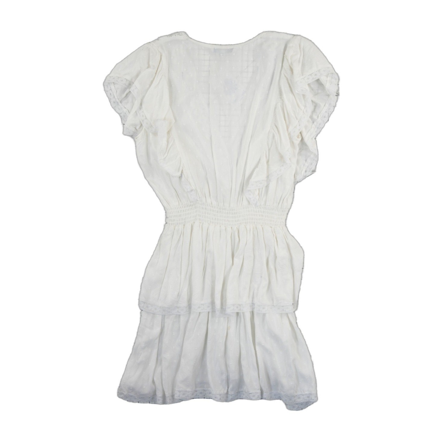 New Blue Island Beach white mini dress crafted from lightweight rayon with delicate swiss dot texture and intricate crochet lace trim. This airy piece features a flattering surplice V-neckline, flutter sleeves, and a smocked elastic waistband for a comfortable fit. The tiered ruffle skirt adds playful movement, making it an ideal choice for a summer vacation, bridal shower, or beach cover-up.