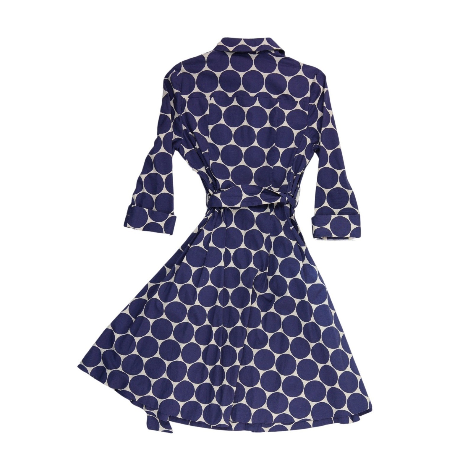 Excellent Condition! Charming shirt dress features a bold oversized polka dot pattern in navy blue and white, crafted from a comfortable cotton blend with a hint of stretch. The silhouette is defined by a classic collar, button-down front, and a matching self-tie belt to cinch the waist. Three-quarter length sleeves with cuffed ends and a flared skirt create a timeless, feminine look suitable for workwear or weekend outings.