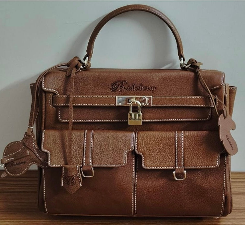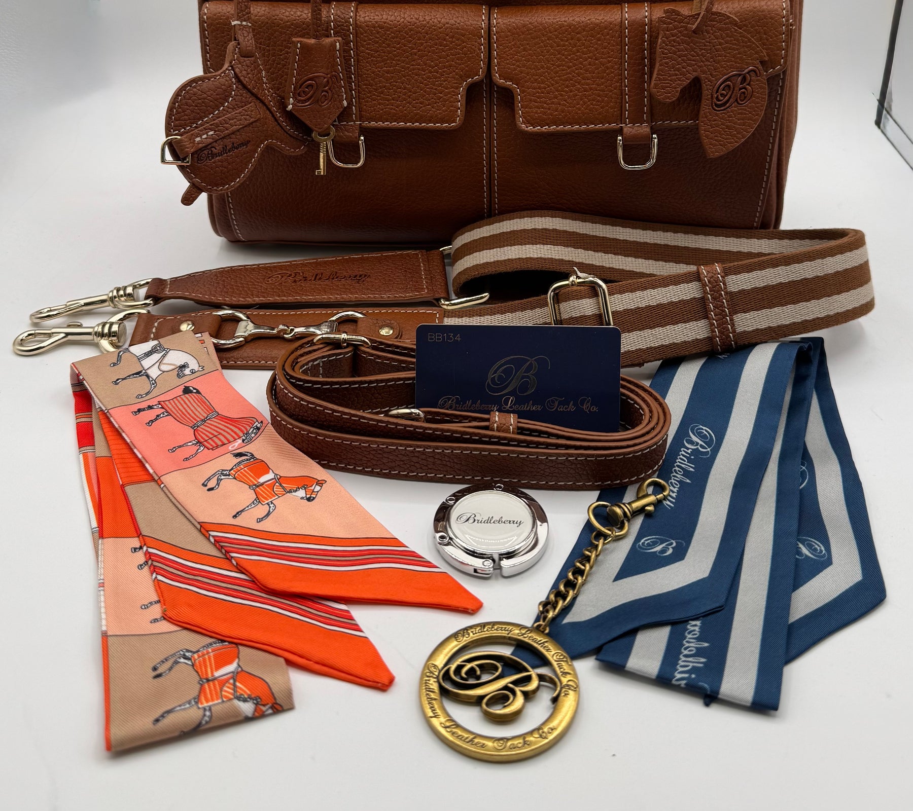 The Saratoga comes with a variety of accessories, including a stylish scarf with a horse pattern print, a striped horse bit shoulder strap, a matching leather shoulder strap, and a unique horse-head and saddle leather charms. The included large “B” charm and a secondary Bridleberry scarf adds versatility to your look. This handbag is not just an accessory; it’s a statement piece for the discerning individual who appreciates timeless design and the spirit of the equestrian life style