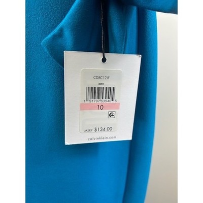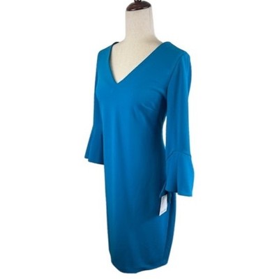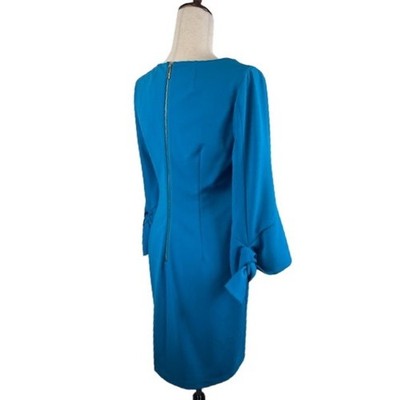 Keywords: Calvin Klein, Blue Dress, Bell Sleeve, Sheath Dress, Cocktail Dress, Career Dress, V Neck, Womens Dress, Size 10, Formal Dress, Party Dress