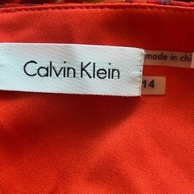 Sunset hues cascade down this stunning Calvin Klein maxi dress, a vibrant statement piece that captures the essence of carefree elegance. The pleated fabric creates a beautiful sense of movement, flowing gracefully with every step. A flattering V-neckline and delicate spaghetti straps add a touch of femininity, while the high-low hemline offers a modern, playful silhouette. Imagine yourself twirling at a summer garden party, sipping cocktails on a breezy patio, or making a grand entrance at a beachside wedding in this unforgettable dress.