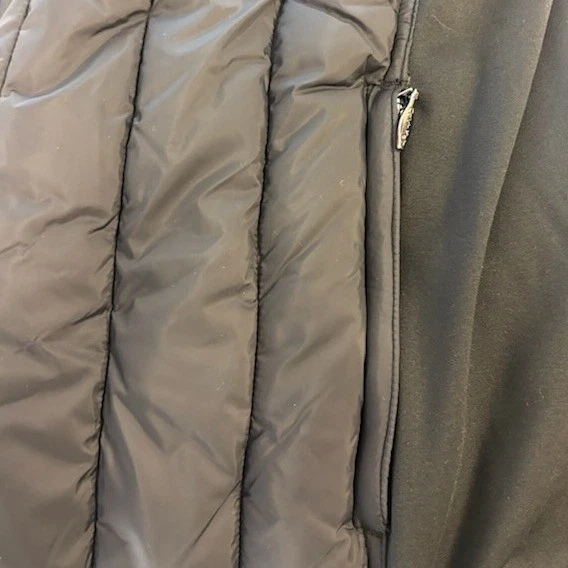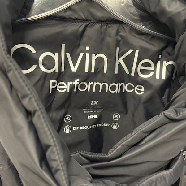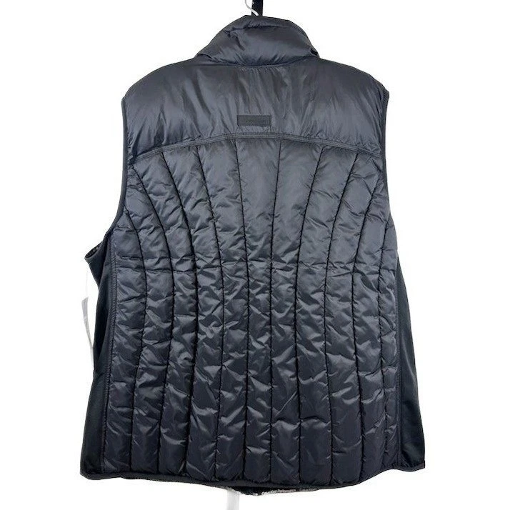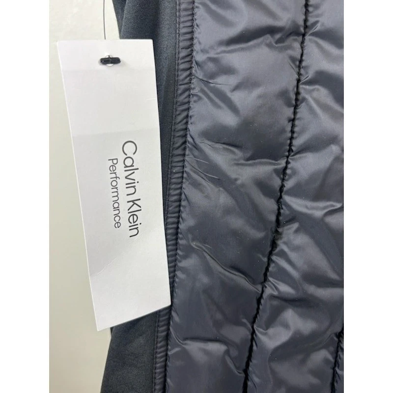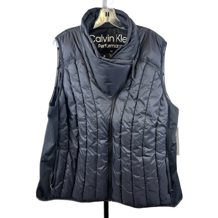 This Calvin Klein Performance quilted puffer vest in black measures 28 inches in length and is 27 inches pit to pit. This vest features a stylish stand collar with an asymmetrical zip closure, providing a modern aesthetic. The design includes a full-zip front for easy wear and secure zip pockets for convenience. Perfect for layering during outdoor activities or casual outings, this vest offers both warmth and a sleek look for transitional weather or active lifestyles.