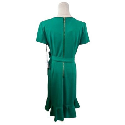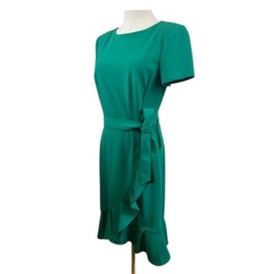New with tags! Emerald elegance awaits with this Calvin Klein sheath dress, a vision of sophisticated charm. Imagine the soft, smooth fabric draping beautifully, creating a flattering silhouette that moves with you. The dress features a classic round neckline and short sleeves, perfect for a polished yet comfortable feel. A self-tie belt cinches the waist, accentuating your figure, while the playful ruffle detail at the hem adds a touch of feminine flair. This dress is ideal for making a statement at your next business meeting, turning heads at a cocktail party, or feeling confident and chic at a special event.