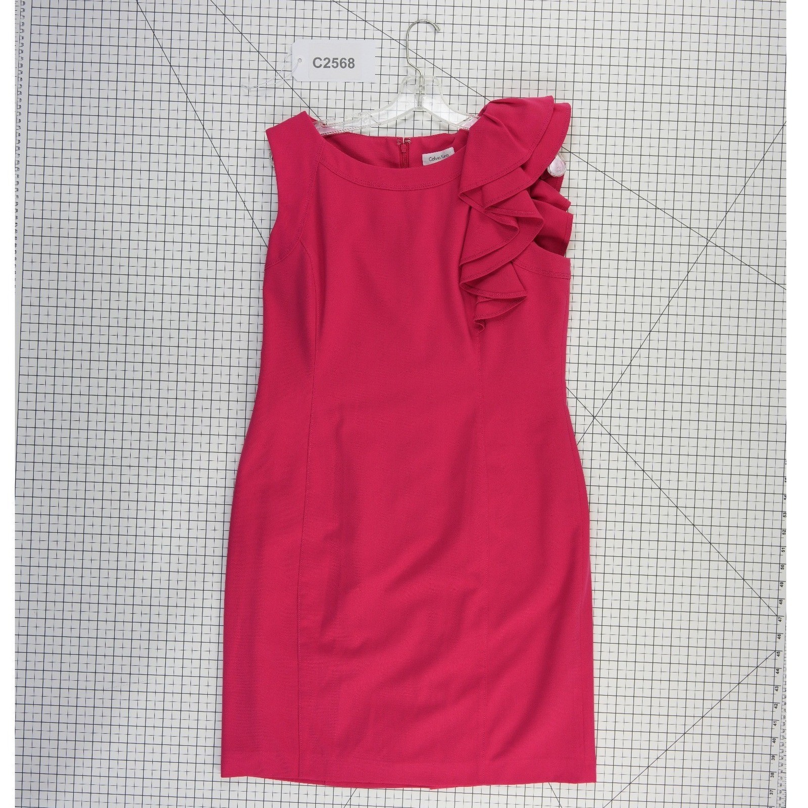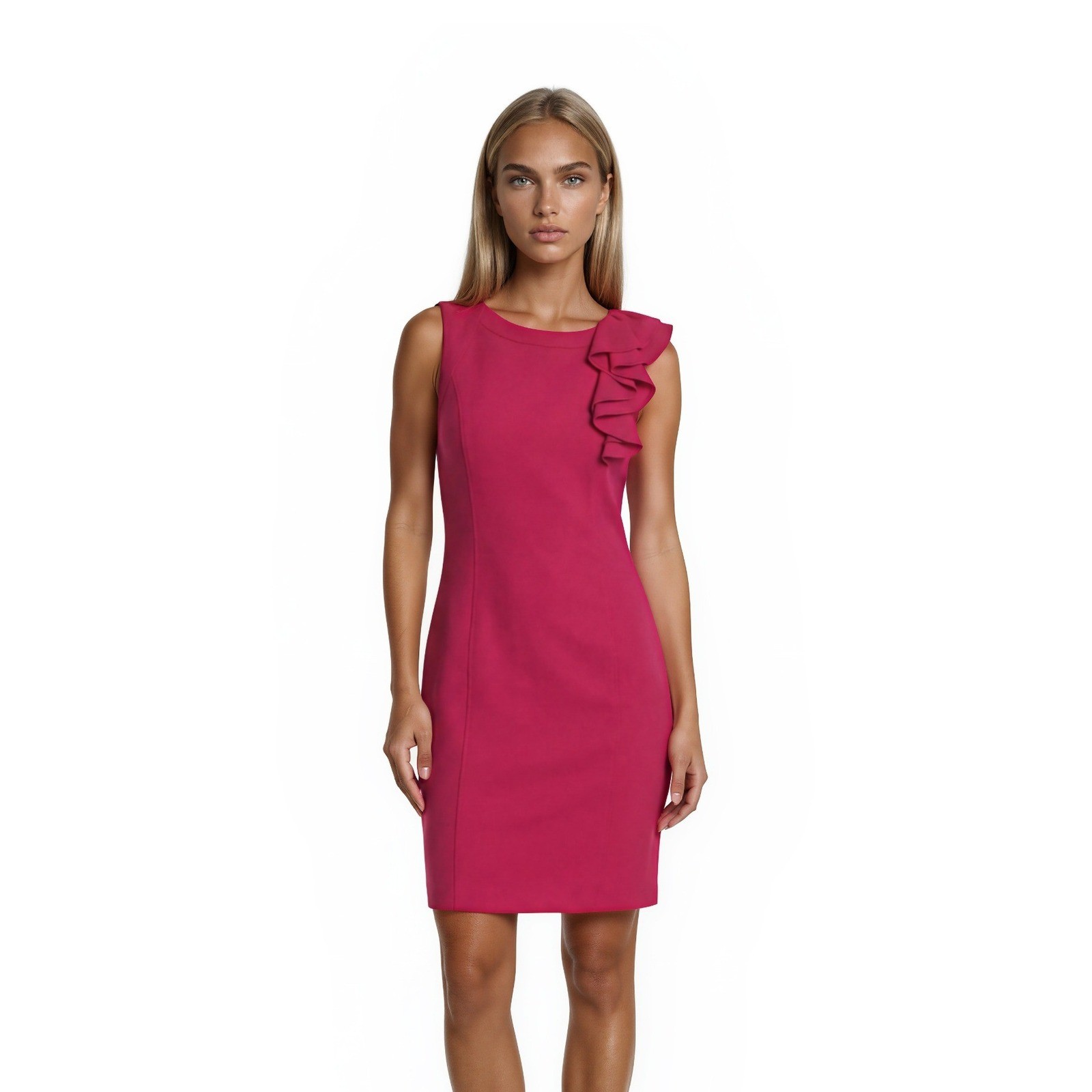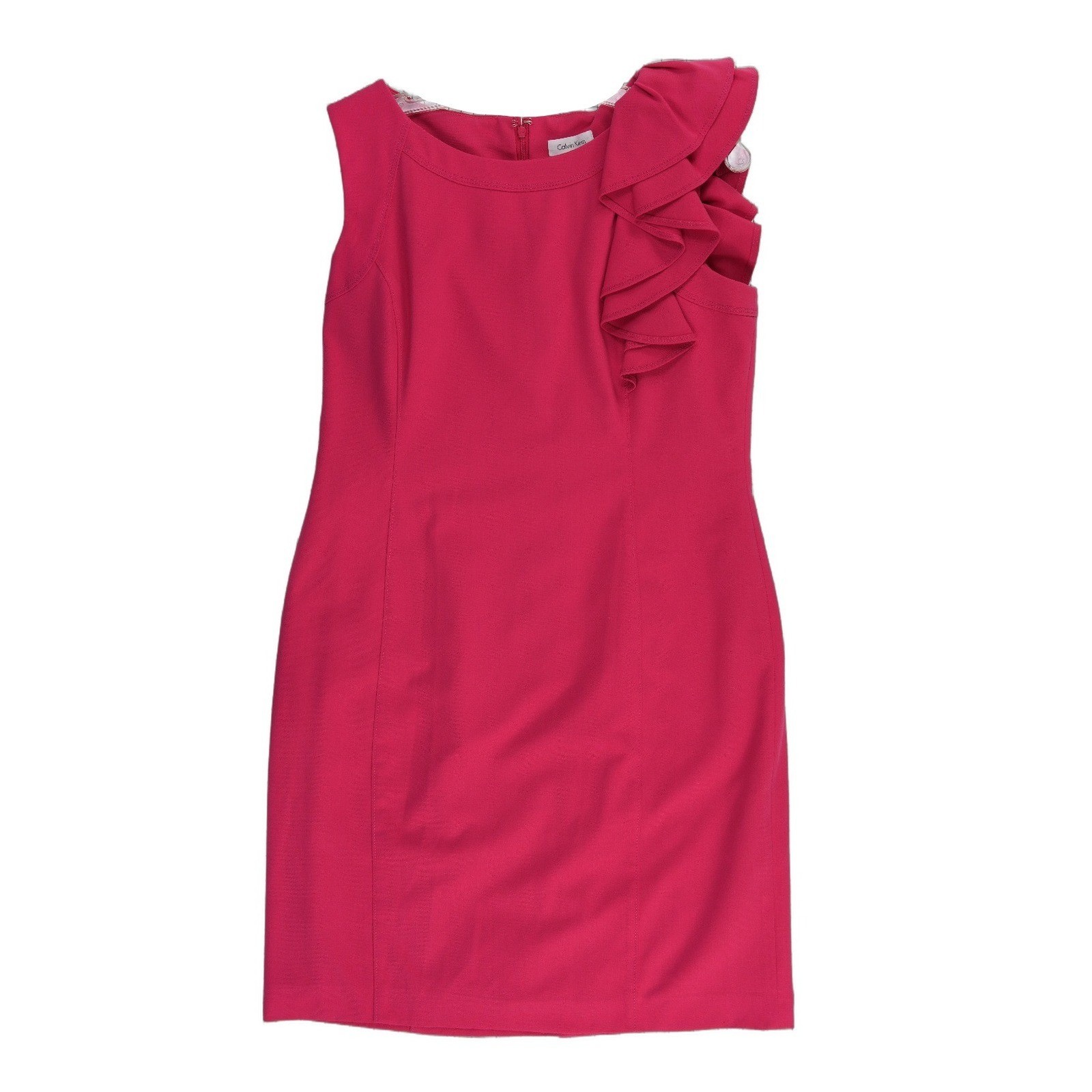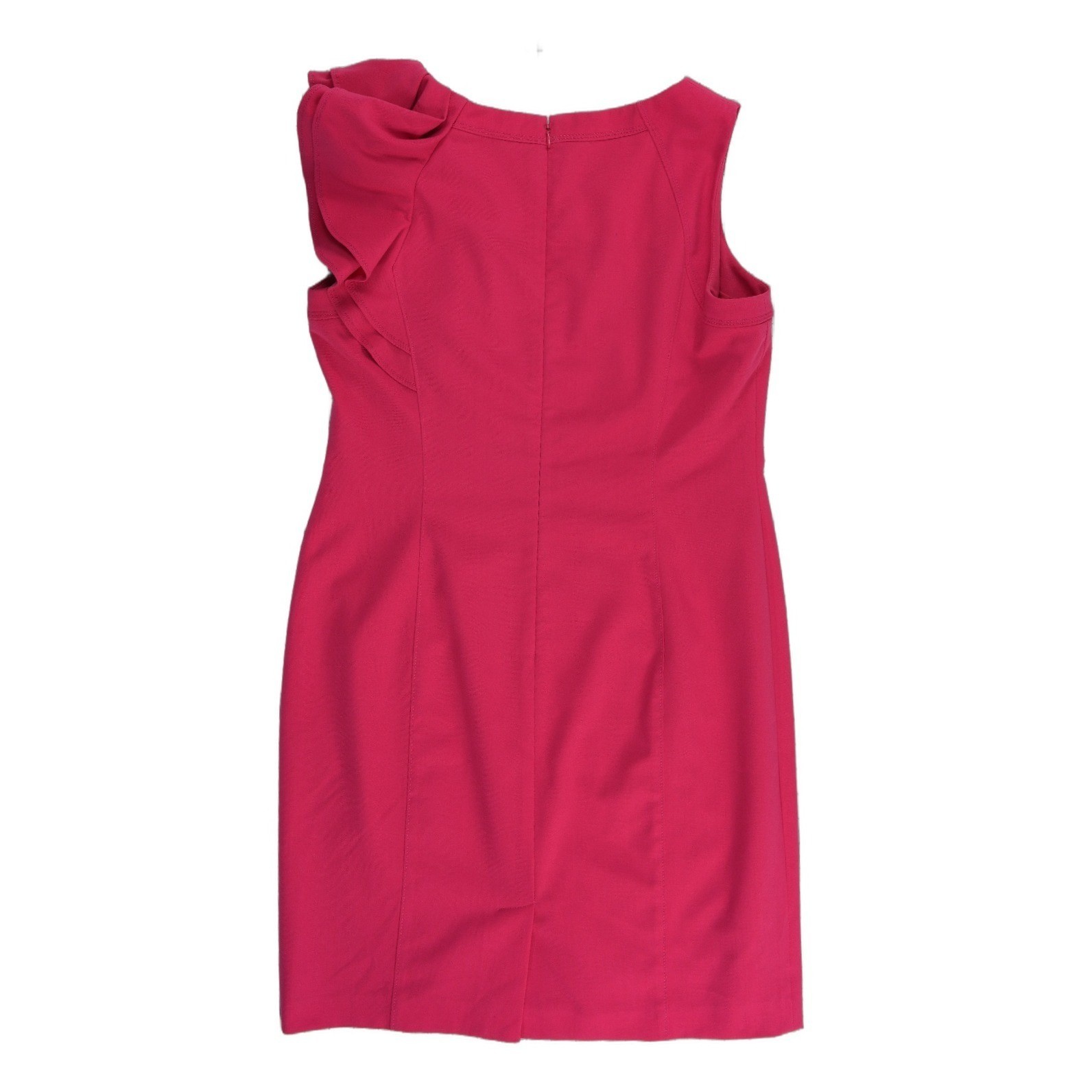 Excellent Condition! Sophisticated sheath dress showcases a vibrant pink hue and a striking tiered ruffle detail at the shoulder. Designed with a classic round neckline and a sleeveless silhouette, this piece offers a polished look suitable for cocktail parties, weddings, or professional events. The structured fabric provides a flattering fit, while the back zipper closure ensures a seamless finish.