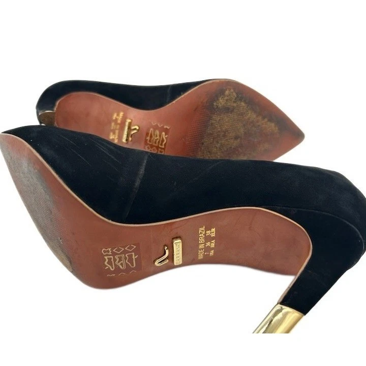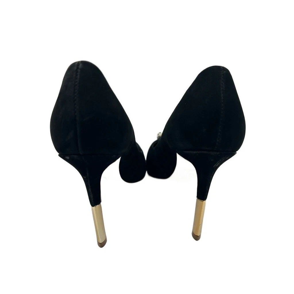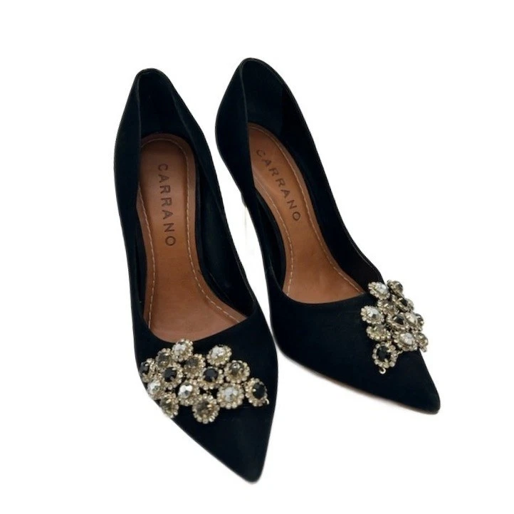 Black suede stiletto pumps from Carrano adorned with sparkling crystal embellishments. These elegant heels feature a pointed toe and a slender metallic gold heel, adding a touch of glamour to any outfit. Perfect for a special evening out or a sophisticated cocktail party.