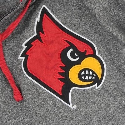 Like new! Champion Louisville Cardinals full zip hoodie in a heathered charcoal gray with a vibrant red lined hood. This performance-style sweatshirt features the iconic Cardinals mascot embroidered on the chest and a smaller logo on the back shoulder. Designed with a soft fleece interior, split kangaroo pockets, and adjustable drawstrings, it offers both comfort and team spirit for game days or casual wear.