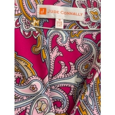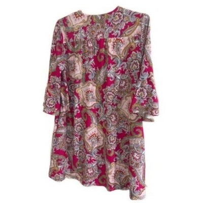 Like new! A Jude Connally shift dress in a vibrant pink paisley print. This charming dress features a flattering V-neckline and stylish bell sleeves, offering a playful yet elegant silhouette. The intricate paisley pattern, a blend of bold pinks with accents of cream, yellow, and blue, creates a visually captivating design. Its comfortable fit and eye-catching print make it perfect for a garden party, a casual brunch, or a day out shopping.