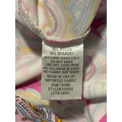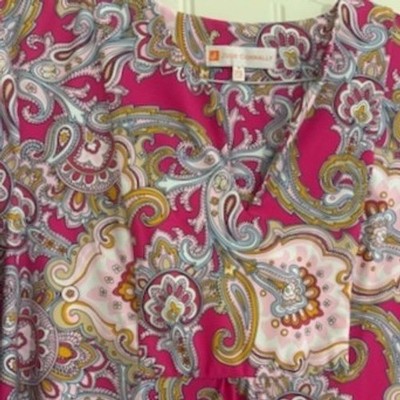 Keywords: Jude Connally dress, pink paisley dress, bell sleeve dress, v neck dress, shift dress, women's dress, midi dress, boho dress, summer dress, designer dress, size medium dress, nylon spandex dress, paisley print, colorful dress, made in usa