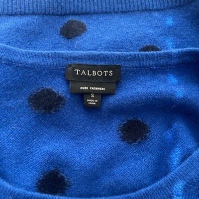 Keywords: Talbots sweater, cashmere sweater, blue polka dot sweater, womens sweater, small sweater, crewneck sweater, designer sweater, luxury sweater, polka dot top, cashmere top, blue and black sweater, soft sweater, comfortable sweater