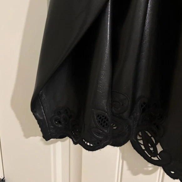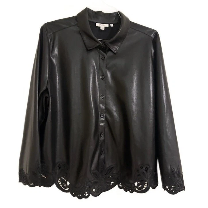Excellent condition! A sophisticated black faux leather button-down shirt. This blouse showcases exquisite laser-cut detailing along the hem, creating a delicate lace-like effect with floral motifs. The classic collared neckline and button-front closure offer a timeless silhouette, while the unique embellishment adds a touch of modern elegance. Perfect for a chic night out or a stylish addition to your work wardrobe.