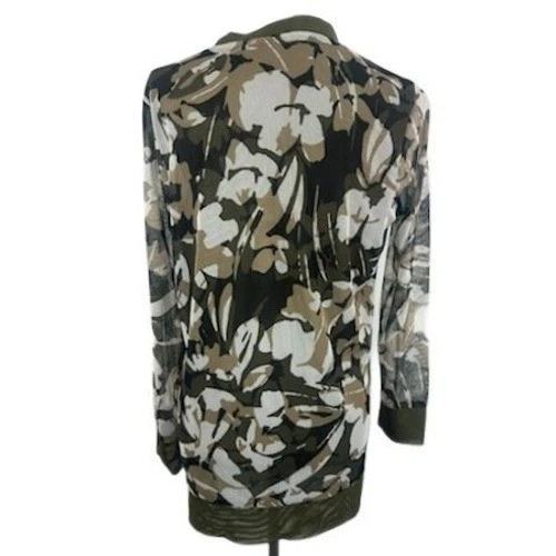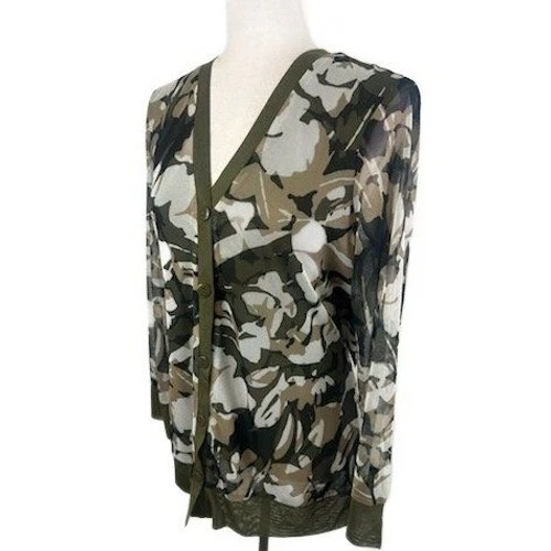 Excellent condition, like new! An elegant floral cardigan, featuring a button-down front and a sophisticated olive green trim. This piece offers a blend of comfort and style, with a lightweight and breathable fabric that drapes beautifully. The cardigan features a unique floral print with muted tones, perfect for adding a touch of understated elegance to any outfit. This cardigan is ideal for layering during transitional seasons or as a chic addition to a business casual ensemble. Suitable for a brunch date, a casual office setting, or an evening out.