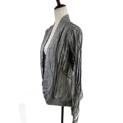 Keywords: Chicos jacket, Royal Ruffle jacket, Cyber Grey blazer, Textured jacket, Open front jacket, Size 1, Crinkled jacket, Elegant jacket, Casual blazer, Office wear, Evening jacket, Chic jacket, Layering piece, Women's jacket, Blazer
