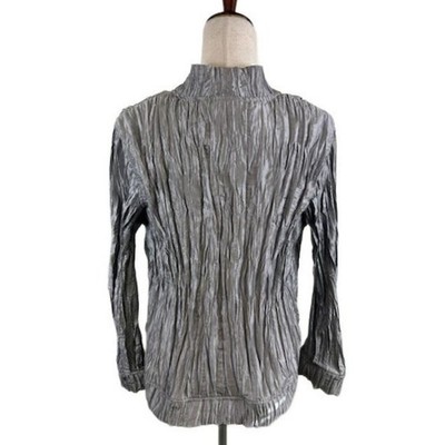 Sophisticated and stylish jacket by Chico's in size 1. This “Royal Ruffle” jacket features a unique, all-over crinkled texture in a chic cyber grey hue, creating a visually interesting and flattering silhouette. It is designed with an open front, making it easy to layer over your favorite tops. The jacket features a refined collar and long sleeves with a cinched hem that adds a touch of elegance. This jacket would be perfect for a business casual setting, a stylish evening out, or adding a touch of texture to a monochromatic outfit.