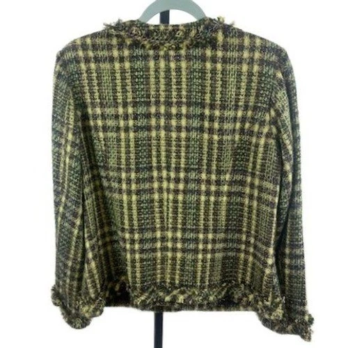 Chicos plaid tweed jacket blazer. This open front jacket features a classic plaid pattern in brown green and yellow hues. Textured fringe detailing adorns the neckline cuffs and pockets adding a touch of bohemian flair. Perfect for a stylish lunch date or a casual office setting.