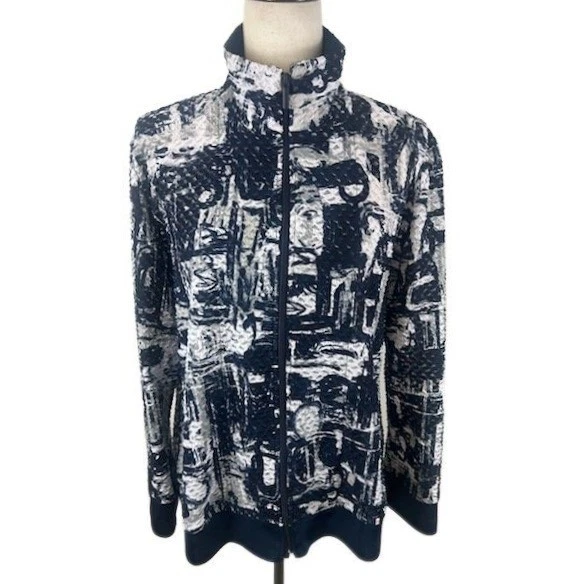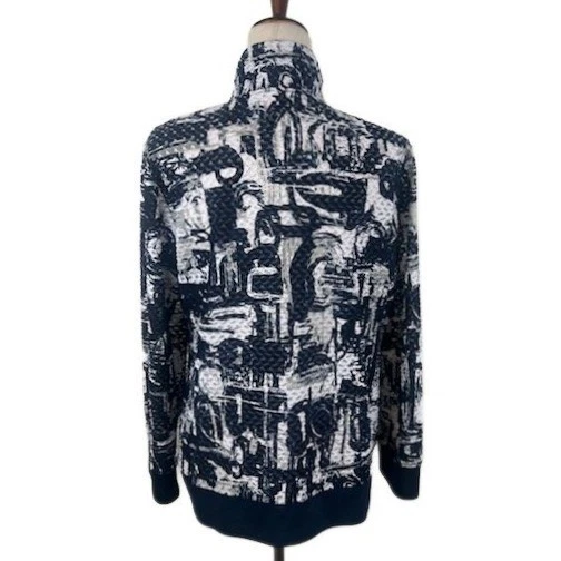 Chic abstract print jacket ready to elevate your wardrobe. This knit zip-front jacket features a mock neck and eye-catching abstract print in black, white, and gray. The unique pattern adds a touch of modern art to your look, while the comfortable knit fabric ensures all-day wearability. With its versatile design, this jacket can be dressed up or down, making it a perfect layering piece for any occasion. Wear it to a casual brunch with friends or as a stylish cover-up for an evening concert in the park.