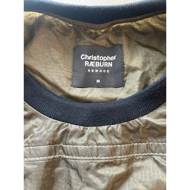 Good condition, no major flaws, rips or stains. Slight fading of logo in spots. Unique olive green REMADE t-shirt by Christopher Raeburn, featuring a boxy and slightly oversized fit with a distinctive design. This eye-catching top has a crew neck with black trim and a bold “REMADE” graphic on the front, adding an urban edge. The unconventional construction and unique silhouette make it a standout piece. Perfect for casual outings, making a statement at social gatherings, or adding an avant-garde touch to your everyday wardrobe.