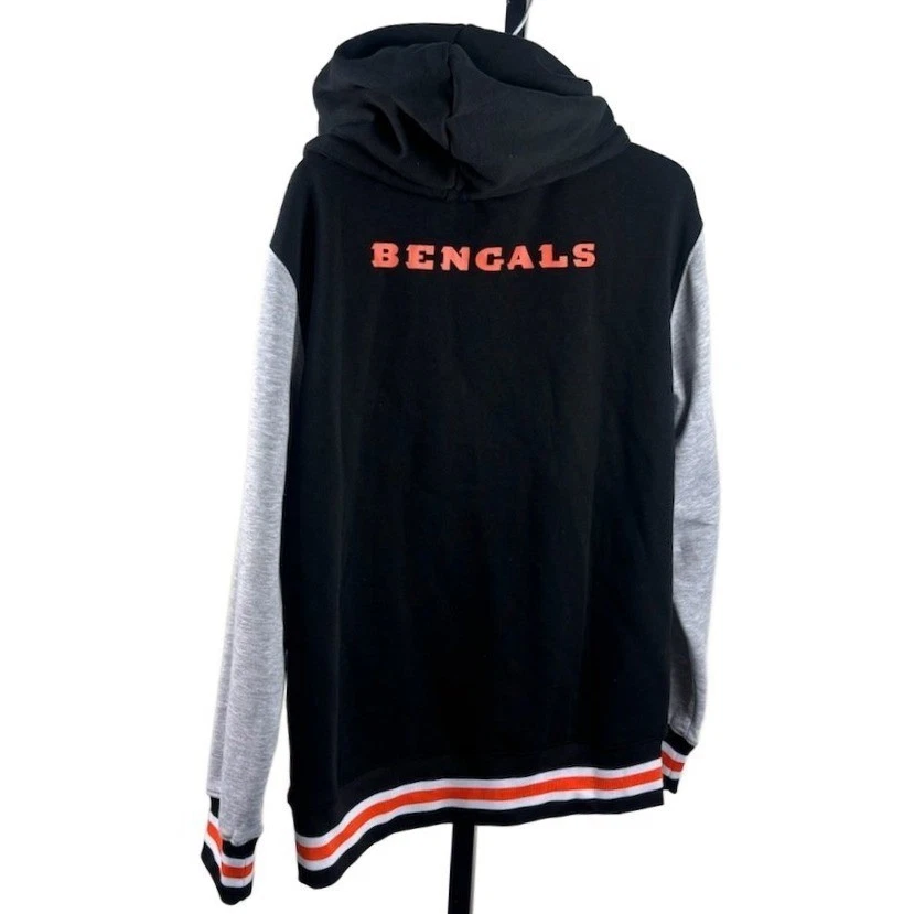 Cincinnati Bengals NFL Team Apparel full zip hoodie in black with gray sleeves. Features the Bengals logo on the left chest and “BENGALS” text across the back. Contrasting orange and black striped cuffs and hem add a sporty touch. A perfect addition for game day or casual wear, ideal for tailgating or watching the game at home.