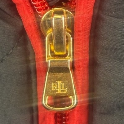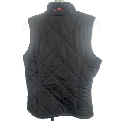 This vest is 22 inches long and 18 inches pit to pit laid flat. A classic black quilted vest with a vibrant red lining and collar. This sleeveless outerwear piece offers a stylish and practical layer for transitional weather. The full zip front closure, accented with a gold zipper featuring the signature RL logo, allows for adjustable comfort and warmth. Two front pockets provide convenient storage for essentials, while the diamond quilting adds a touch of timeless appeal. Perfect for casual outings, layering over sweaters for a cozy look, or adding a sporty element to your everyday ensemble.
