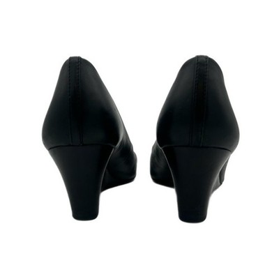 A classic pair of Tory Burch wedge heel pumps to elevate your wardrobe. These timeless shoes feature a sleek black leather upper, a comfortable wedge heel, and a touch of luxury with the signature gold-tone Tory Burch logo on the cap toe. This versatile footwear option is ideal for adding a touch of sophistication to any outfit, equally suited for the office, a lunch date, or a night out.