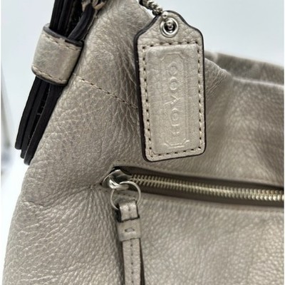 Keywords: COACH, leather shoulder bag, hobo bag, satchel, gray purse, silver hardware, designer handbag, pebbled leather, crossbody bag, everyday bag, womens accessories, authentic coach, zip closure, casual bag