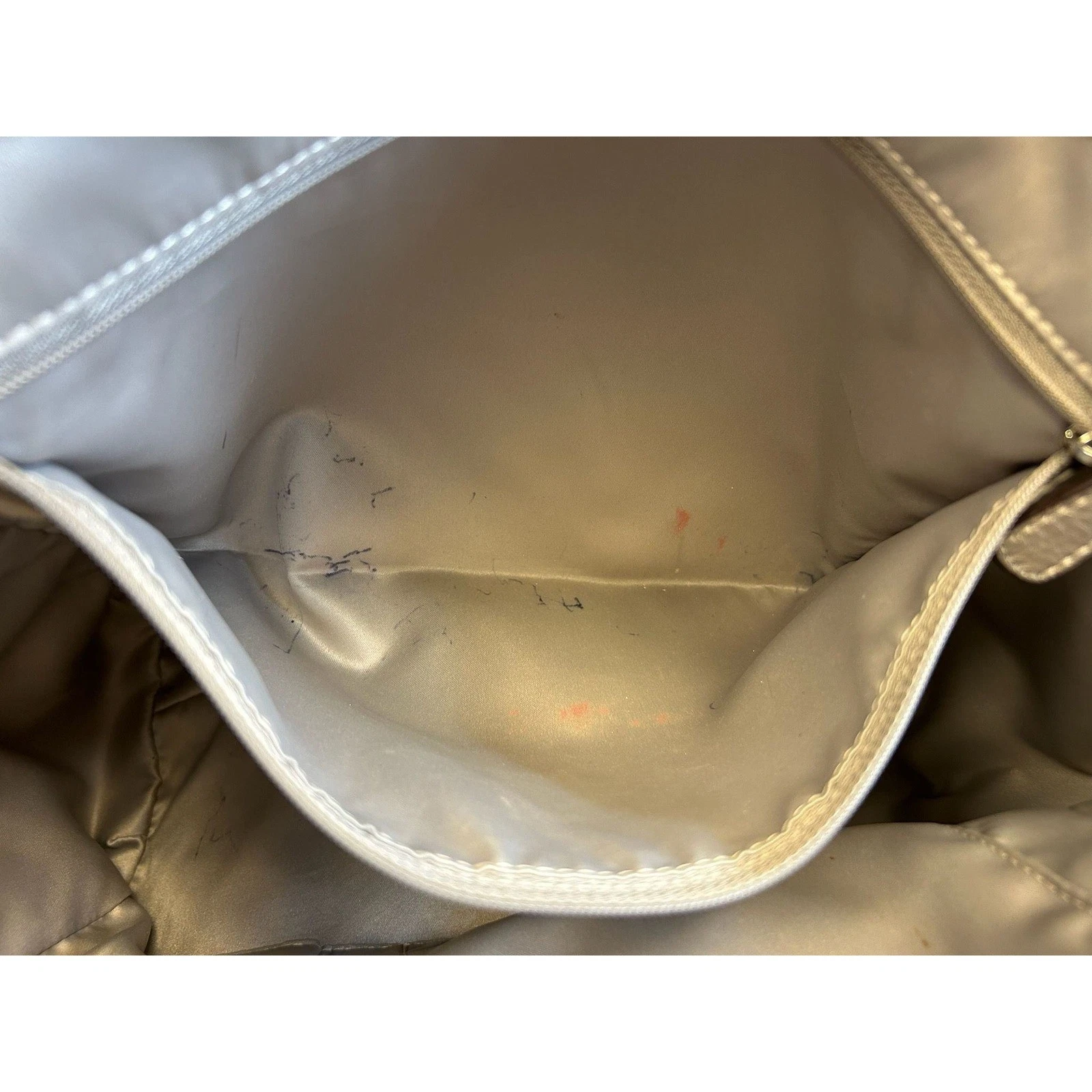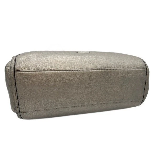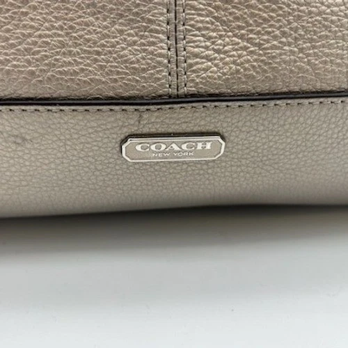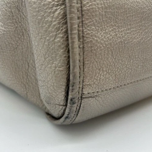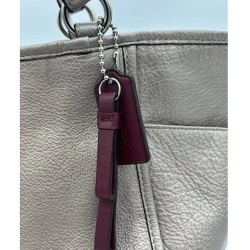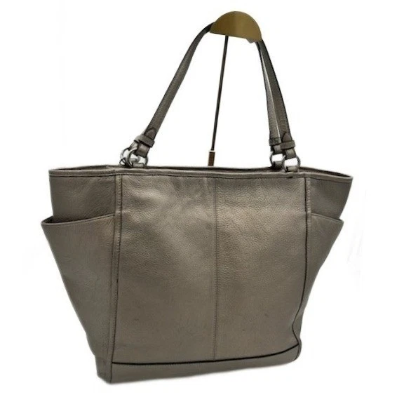 Approximately 14 x 18 inches without handles. A versatile Coach metallic pebble leather tote bag. This spacious tote features a shimmering silver exterior with a textured pebble leather finish. Multiple exterior pockets offer convenient storage for on-the-go essentials. The classic silhouette and durable construction make it perfect for everyday use, work, or travel.