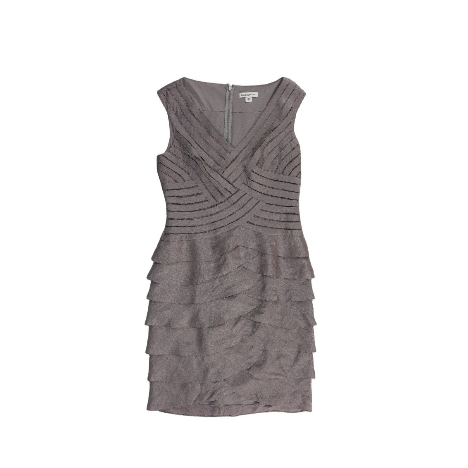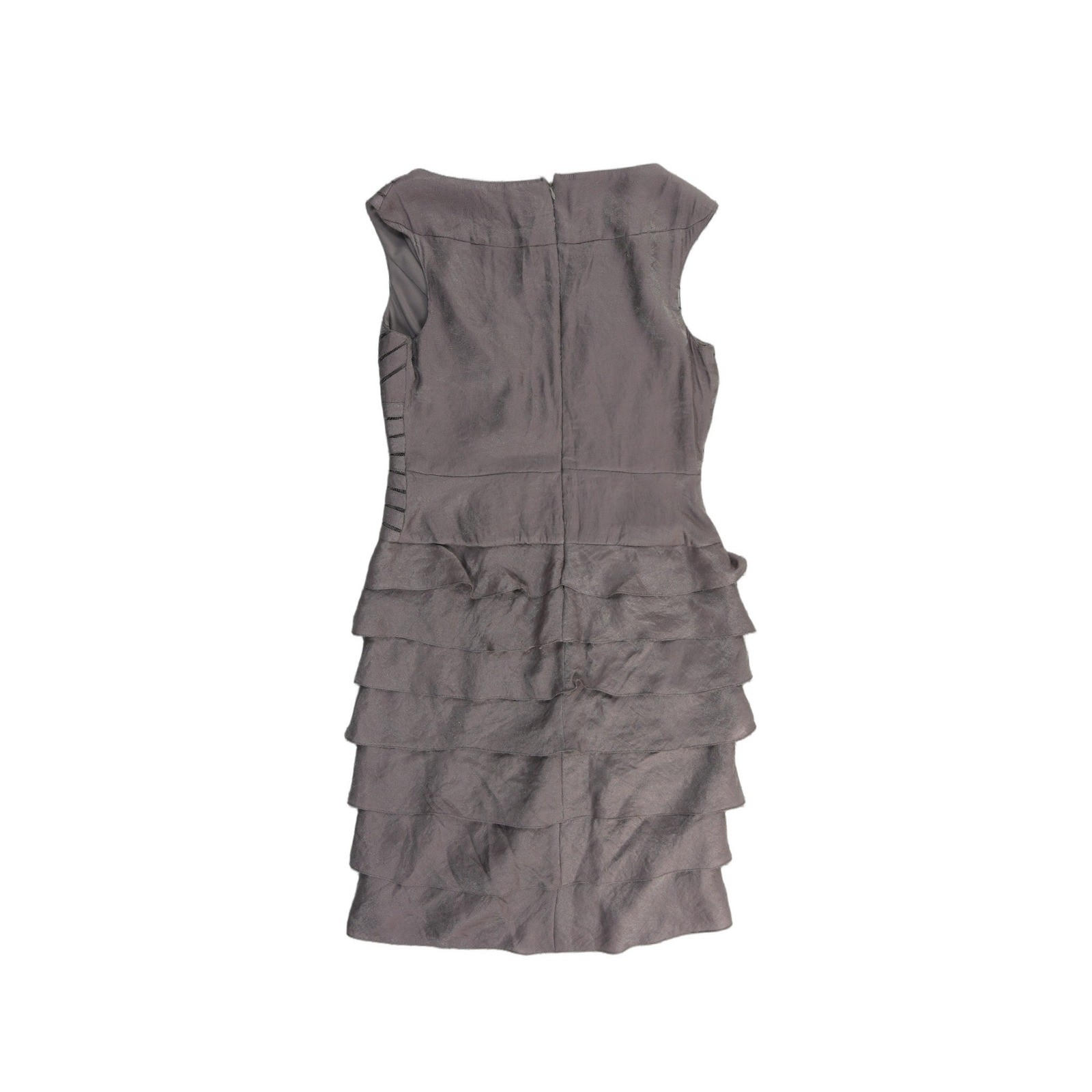 Keywords: Cocktail, Party, Wedding Guest, Tiered, Ruffle, Bandage, Mesh, Textured, Evening, Formal, Sheath, Grey, Sleeveless, Elegant, Classic