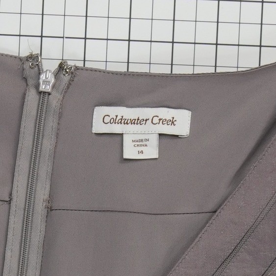 Excellent Condition! Coldwater Creek sleeveless sheath dress features a sophisticated tiered ruffle skirt and a criss-cross bandage-style bodice with subtle mesh inserts. This elegant cocktail piece is designed with a V-neckline and a discreet back zipper closure, offering a textured, monochromatic look in a versatile charcoal grey hue. The fabric has a slight sheen that catches the light, making it perfect for weddings, parties, or evening events.