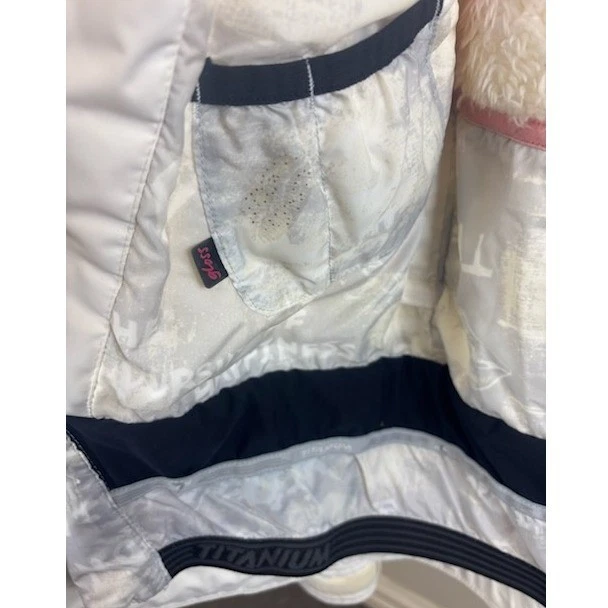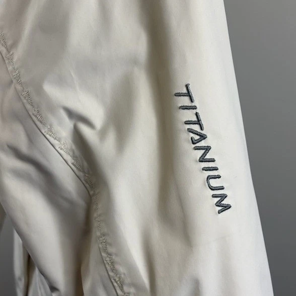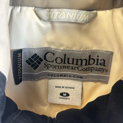 Columbia jacket is 24 inches in length, 19 inches pit to pit and has a sleeve length of 23 inches. Columbia Sportswear Titanium Omni Tech ski jacket in a cream color. This jacket is designed for performance and warmth, featuring a waterproof and breathable Omni Tech outer shell and a plush fleece lining for superior insulation. Multiple exterior pockets offer convenient storage, while the interior boasts organized compartments for essentials. An ideal choice for hitting the slopes or navigating cold weather adventures.