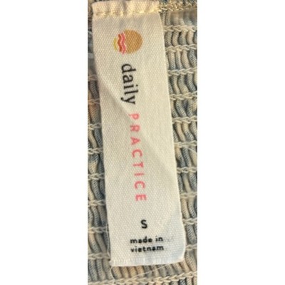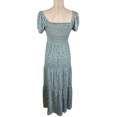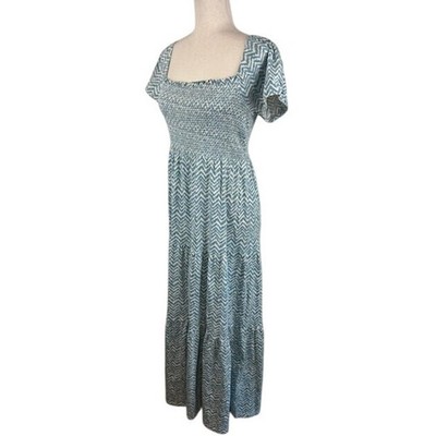Keywords: Daily Practice, maxi dress, women's dress, chevron pattern, smocked bodice, tiered dress, casual dress, summer dress, boho dress, size S, blue dress, white dress, square neckline