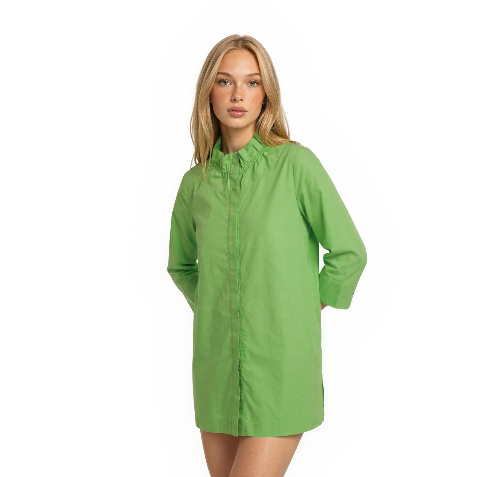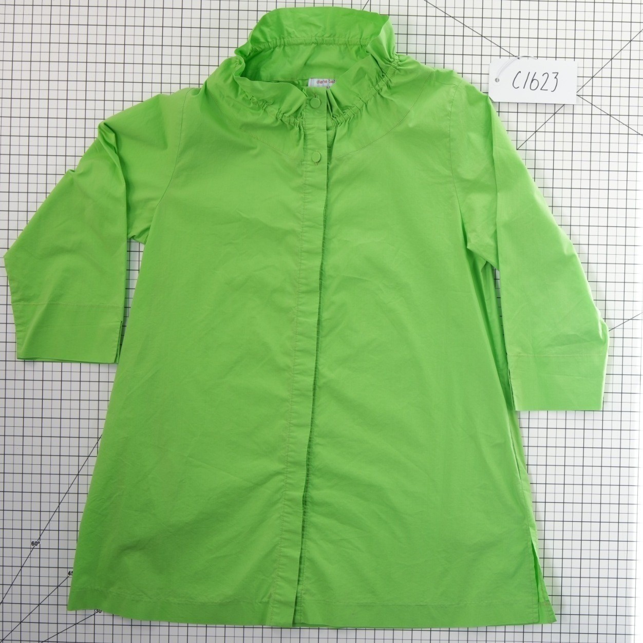 Exxcellent Condition! Diane Bailey button-front tunic top in a vibrant lime green hue. This lightweight piece features a unique ruffled high neck and a hidden button placket for a clean, sophisticated look. Designed with 3/4 length sleeves and side slits at the hem, it offers a relaxed yet tailored silhouette perfect for coastal or casual wear. The stretch cotton blend ensures comfort throughout the day.