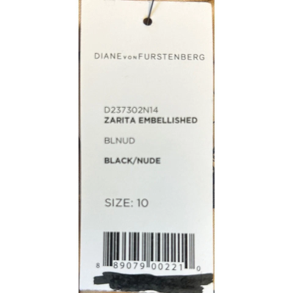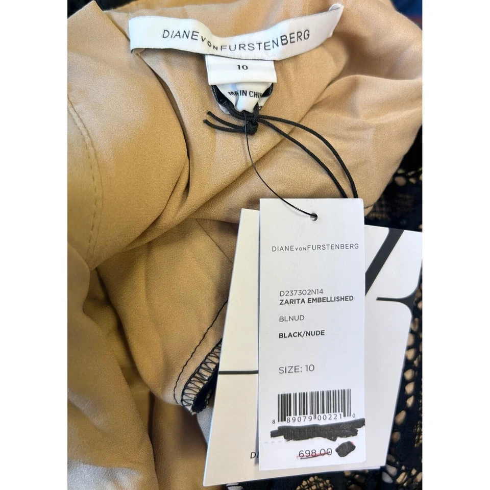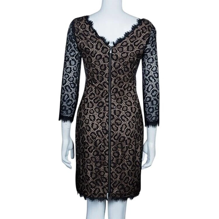 Commanding elegance arrives in this Diane von Furstenberg lace dress, a sophisticated statement piece for your wardrobe. The intricate black lace overlay creates a mesmerizing pattern against the nude lining, offering a peek-a-boo effect that’s both alluring and refined. The dress features a flattering boat neckline and chic 3/4 sleeves, perfect for transitioning between seasons. A full-length back zipper ensures a smooth, seamless fit, while the knee-length cut maintains a classic, timeless silhouette. This dress is ideal for cocktail parties, date nights, or any special occasion where you want to make a lasting impression.