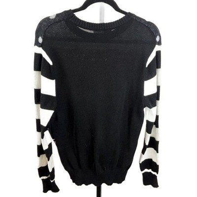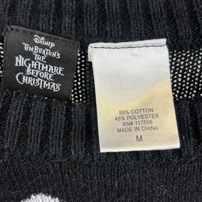 This Nightmare Before Christmas men's sweater measures 27 inches in length and has a 26 inch sleeve length. A festive black sweater featuring Jack Skellington in a Santa hat, surrounded by holiday motifs like snowflakes, Christmas trees, and bats. The sleeves are adorned with bold black and white stripes. This sweater is perfect for holiday parties or casual wear during the festive season.