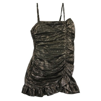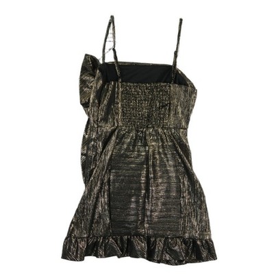 Excellent Condition! Shimmering metallic mini dress features a striking ruched design with a dramatic side ruffle and flounced hem. Crafted from a textured gold and black fabric, this party-ready piece includes adjustable spaghetti straps and a smocked back panel for a comfortable, body-conforming fit. The asymmetrical ruffle detailing adds a bold, architectural element to the classic cocktail silhouette, making it an ideal choice for New Year's Eve, club nights, or festive celebrations.