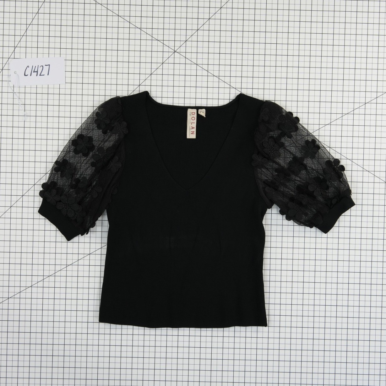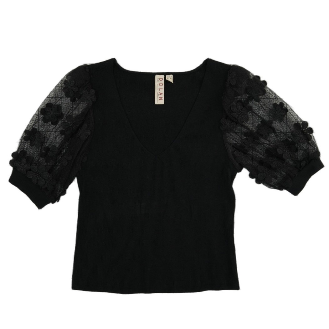 Excellent Condition! Elevated knit top features a ribbed bodice paired with dramatic puff sleeves in a sheer floral lace. The V-neckline and fitted silhouette create a sophisticated profile, while the 3D floral appliqués on the sleeves add a romantic, feminine touch. This versatile piece transitions effortlessly from day to evening wear.