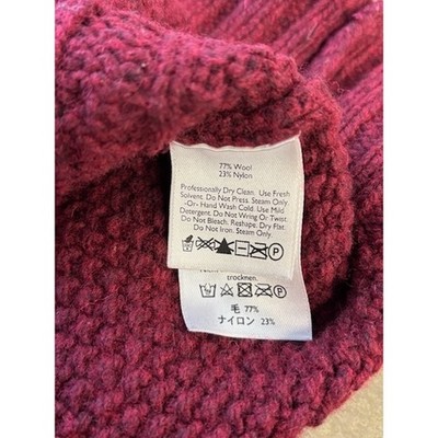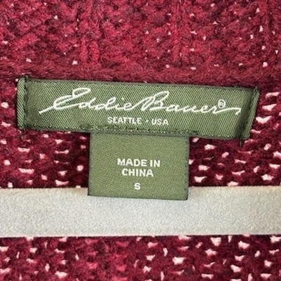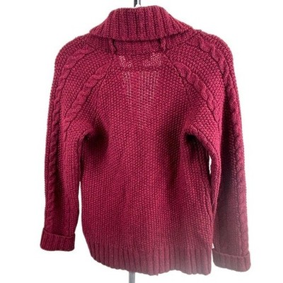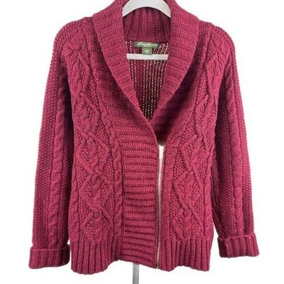 This is a women's and measures 18 inches pit to pit laid flat, 24 inches in length with a 24 inch sleeve length. Eddie Bauer cable knit cardigan sweater in a rich burgundy hue. This stylish piece features a cozy shawl collar and a convenient zip-up front, making it perfect for layering. Intricate cable knit detailing adds texture and visual appeal, while the ribbed cuffs and hem provide a comfortable fit. Ideal for chilly autumn days or as a sophisticated addition to your winter wardrobe.