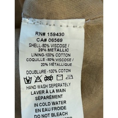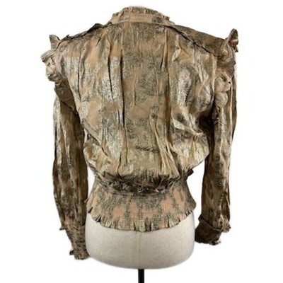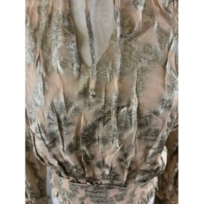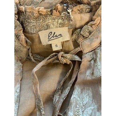 Keywords: Elan, blouse, womens top, ruffle trim, long sleeve, tie neck, metallic accent, beige blouse, size S, bohemian, boho chic, evening blouse, party top, smocked waist