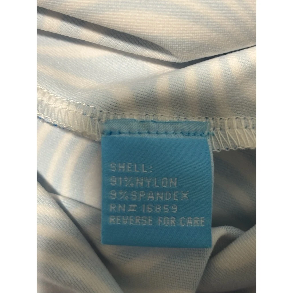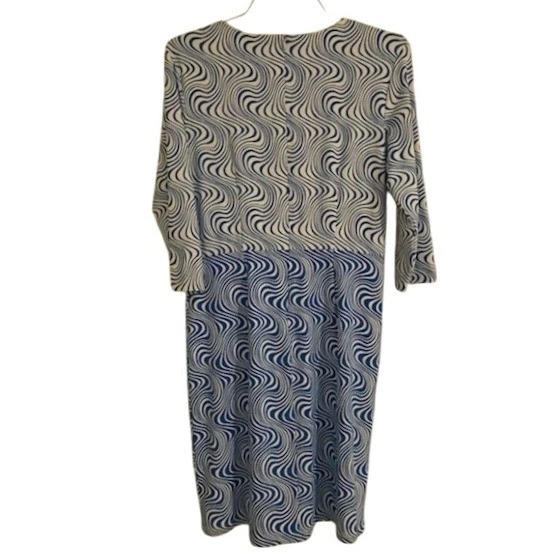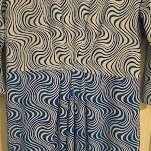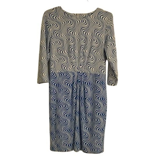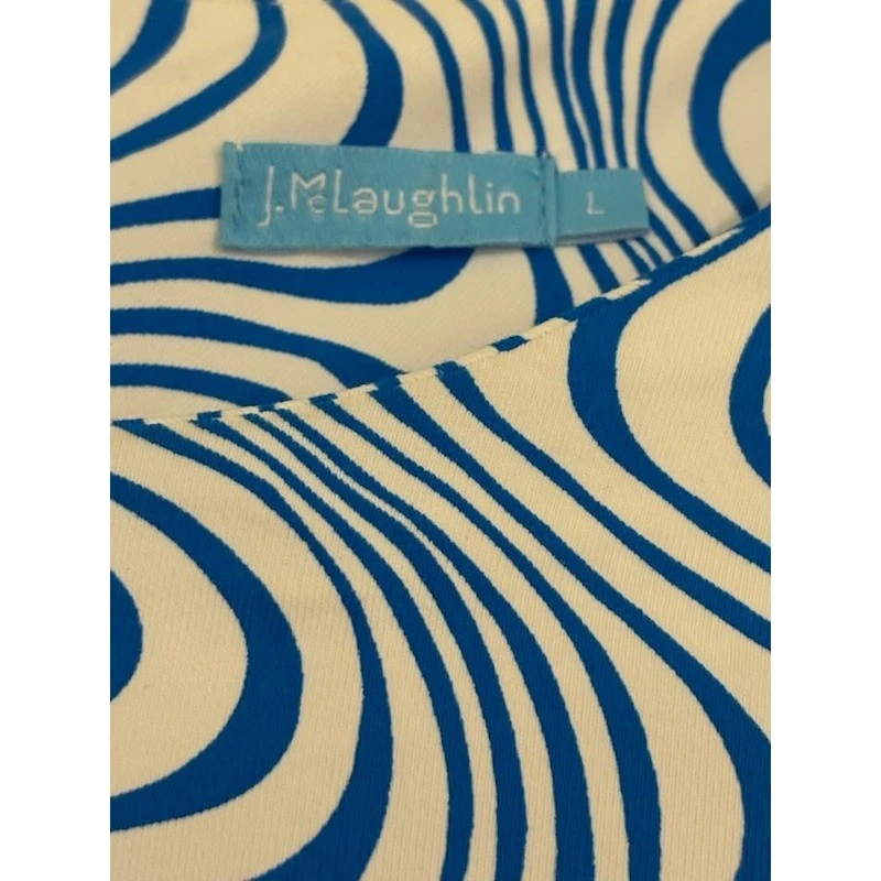 Excellent condition! J.McLaughlin blue and white swirl print dress. This stylish dress showcases a mesmerizing wavy pattern, artfully divided into two distinct sections. The upper bodice and sleeves feature a more delicate swirl, transitioning into a bolder, more pronounced pattern on the skirt. Thoughtful pleating at the waist adds a flattering silhouette and elegant drape. Its versatile design makes it perfect for a casual brunch, a sophisticated daytime event, or a relaxed evening out.