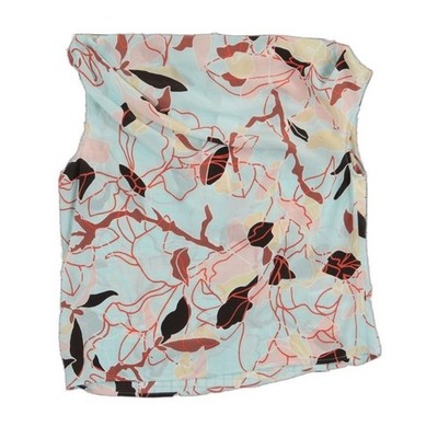New with tags. Equipment Femme Oriana silk top in Starlight Blue Multi features a fluid, sleeveless silhouette with a sophisticated draped cowl neckline. The sheer, lightweight fabric is adorned with an abstract botanical print in shades of blue, peach, and dark brown, offering a modern take on floral patterns. This versatile piece transitions effortlessly from professional settings to evening outings, providing a refined and airy feel.