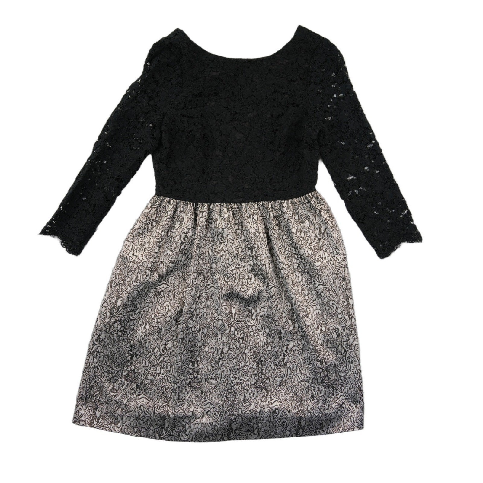 Excellent Condition! Elegant cocktail dress features a sophisticated mixed-media design with a floral lace bodice and a metallic brocade skirt. The long sleeves and scoop neckline transition into a dramatic V-back with a concealed zipper closure. The fit-and-flare silhouette is accentuated by a gathered waistline, creating a timeless look perfect for evening events, holiday parties, or weddings.