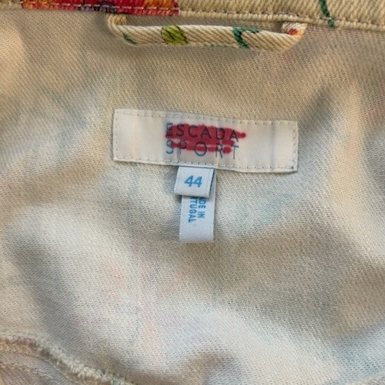 Keywords: Escada, corduroy jacket, floral print, designer blazer, spring fashion, fall fashion, textured, tailored, boutique style, European size, button front, botanical print, statement piece