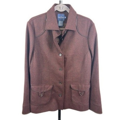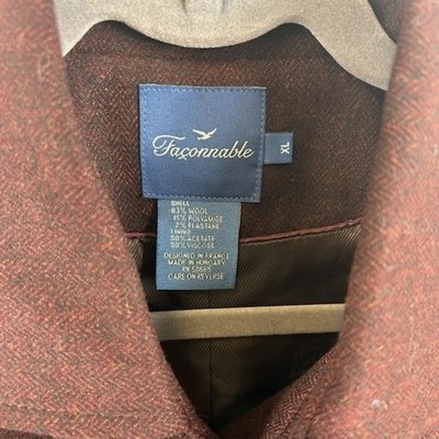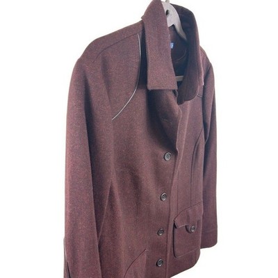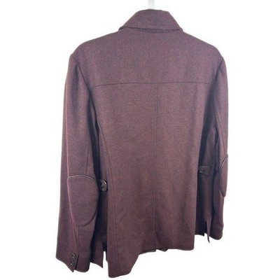 Keywords: Facconable blazer, wool blend jacket, burgundy outerwear, leather trim, button front, tailored fit, sophisticated style, business casual, smart casual, textured fabric, fall fashion, winter wear, classic jacket