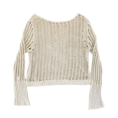 Excellent condition! Lightweight open knit sweater features a breezy pointelle and ladder stitch design, perfect for layering during transitional seasons. Crafted from a comfortable cotton-linen blend, it offers a relaxed silhouette with a wide scoop neckline and flared ribbed cuffs for a touch of bohemian flair. The marled neutral yarn creates a subtle textured look that pairs effortlessly with denim or skirts.