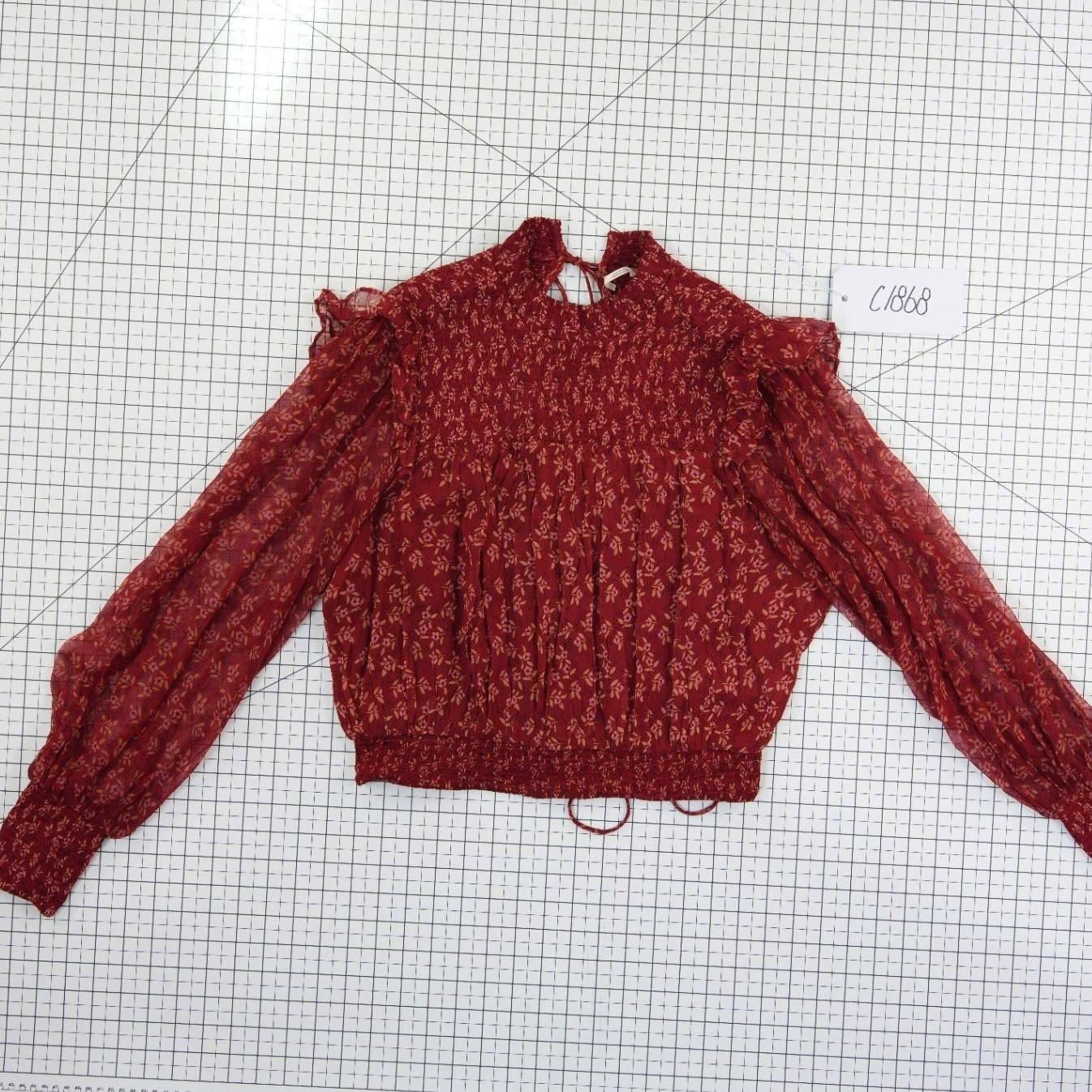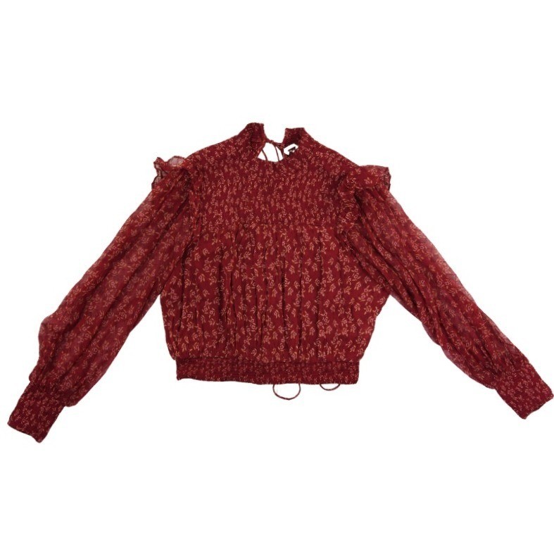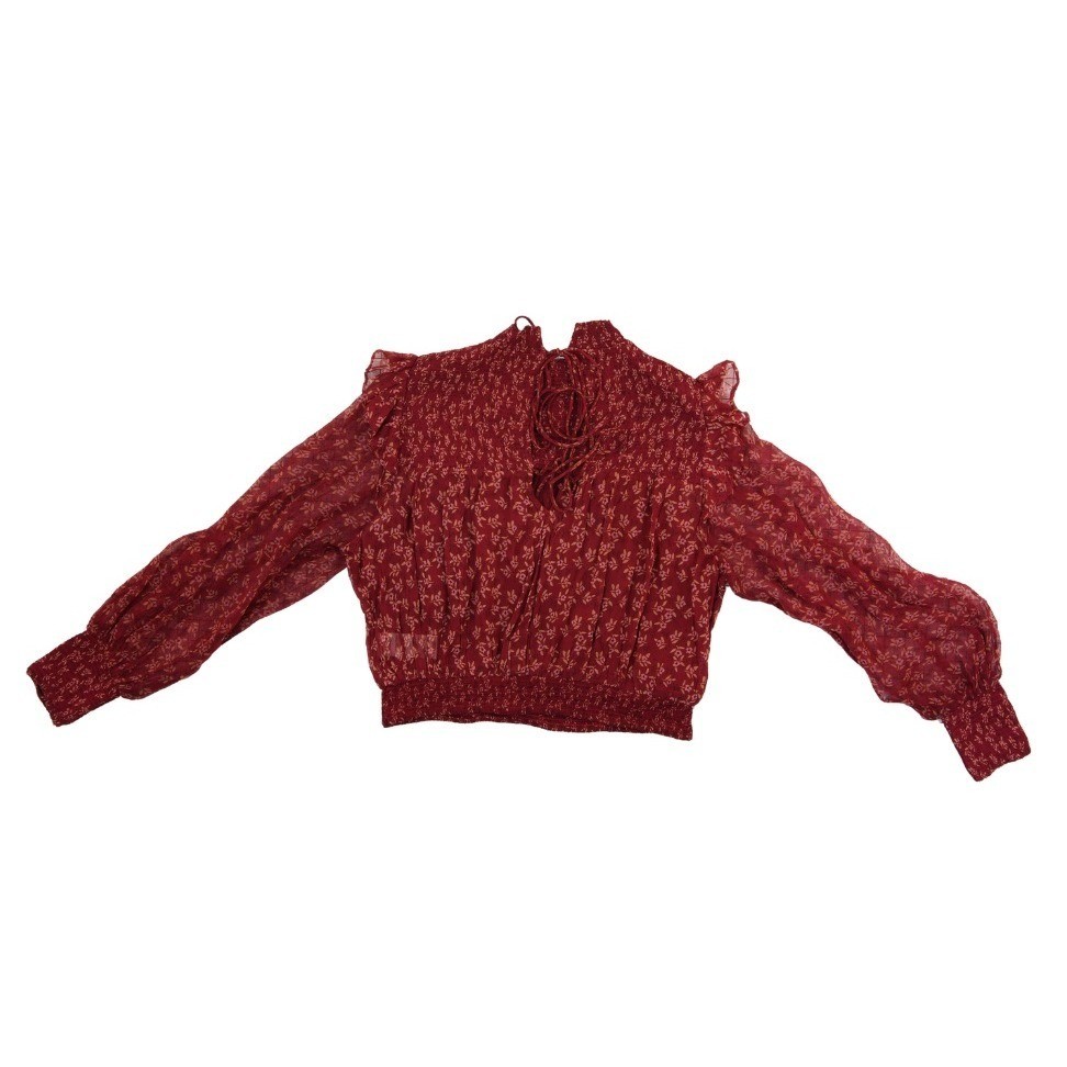 New with tags! Smocked floral blouse showcases a rich burgundy hue with a delicate all-over print. Designed with a high mock neckline and romantic ruffle trim at the shoulders, it features voluminous long sleeves ending in smocked cuffs. The bodice is fully smocked for a flexible, cropped fit, and the back is finished with a charming keyhole tie closure. Crafted from lightweight, breathable viscose with a subtle crinkle texture, this top offers a blend of bohemian elegance and modern style.
