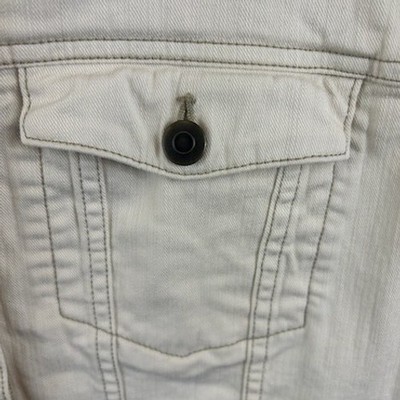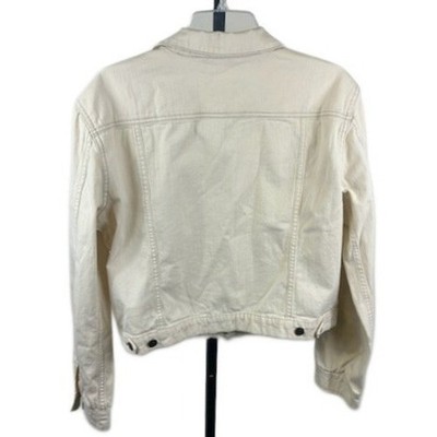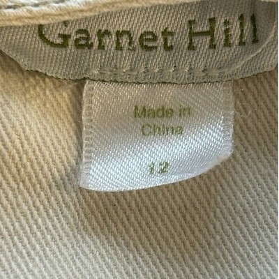 Garnet Hill cream denim jacket. This classic trucker-style jacket features a button-front closure, two chest pockets with button closures, and long sleeves with button cuffs. The neutral cream color makes it a versatile layering piece for any wardrobe. Perfect for casual outings, weekend adventures, or as a transitional layer between seasons.