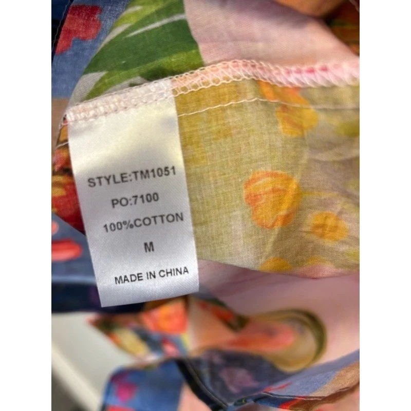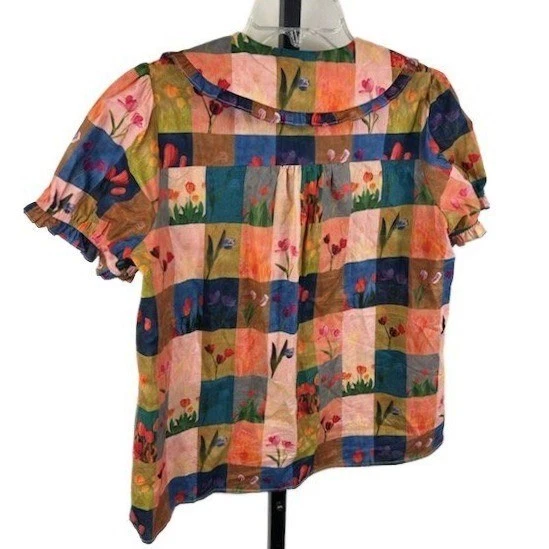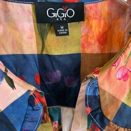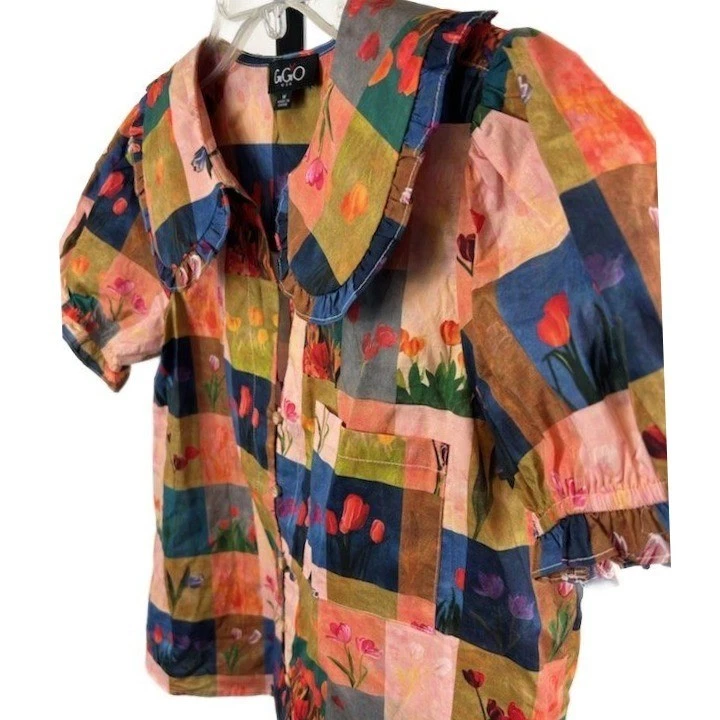 Like new! GiGiO USA women’s short sleeve button-up shirt in size medium featuring a vibrant patchwork print with various floral motifs. The collared neckline is accented with a ruffled trim, echoed in the ruffled sleeve cuffs. A single chest pocket adds a practical touch to this eye-catching piece. Perfect for a casual brunch or a garden party.