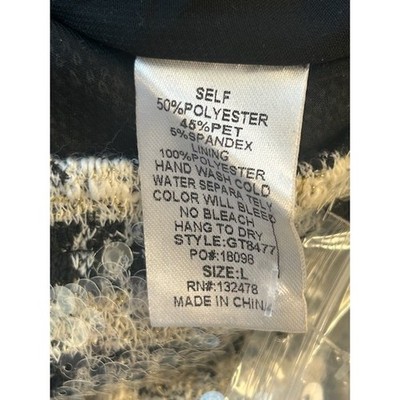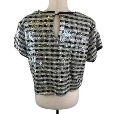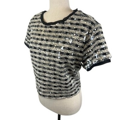 Like new! Striking sequin top, designed to capture attention with its unique details. Horizontal stripes alternate between black and beige, while dazzling sequins add a touch of sparkle. The top features a boxy silhouette, short sleeves, and a round neckline trimmed with black fabric. On the back, a small teardrop cutout adds a hint of allure. This top is perfect for cocktail parties, evening events, or adding a touch of glamour to a night out.