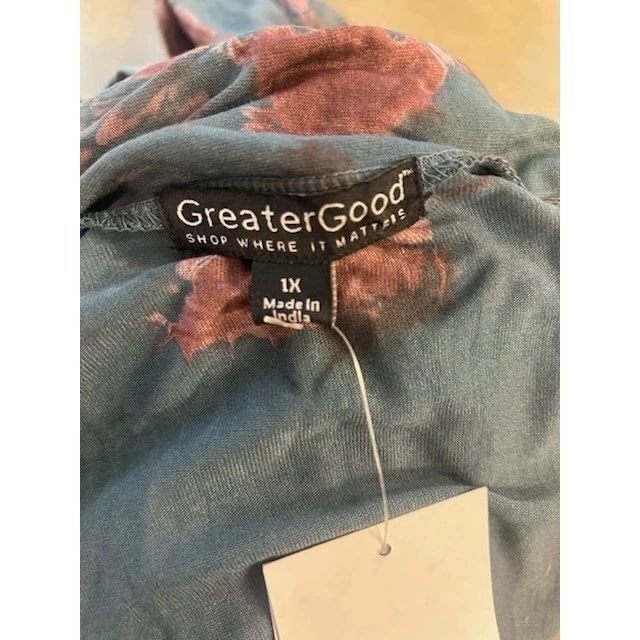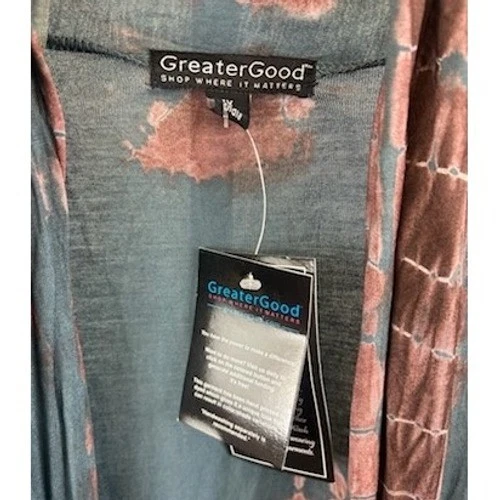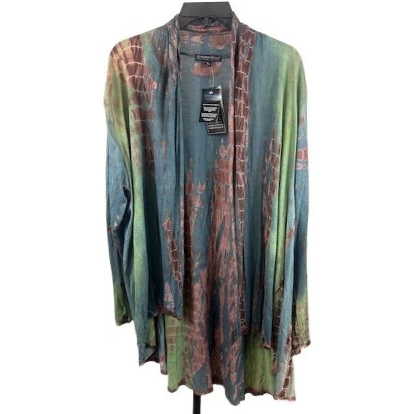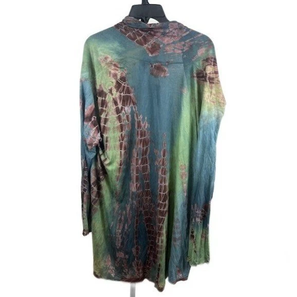 GreaterGood open front cardigan duster in a captivating tie dye pattern. This long sleeve piece features a flowing silhouette with an asymmetrical hemline, offering a stylish and comfortable layer. Its unique blue green and brown color combination makes it a versatile addition to any wardrobe. Perfect for casual outings, travel, or layering over a simple top.