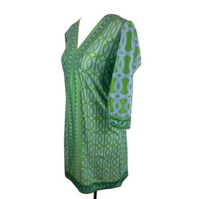 Keywords: Gretchen Scott, dress, womens dress, geometric print, green dress, blue dress, 3/4 sleeve dress, casual dress, stretch dress, V-neck dress, boho dress, bohemian dress, designer dress, preowned dress