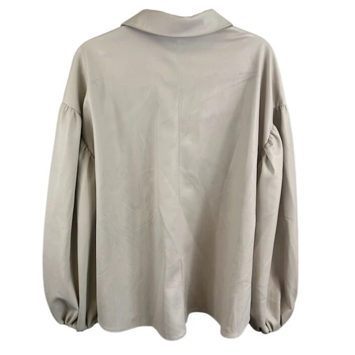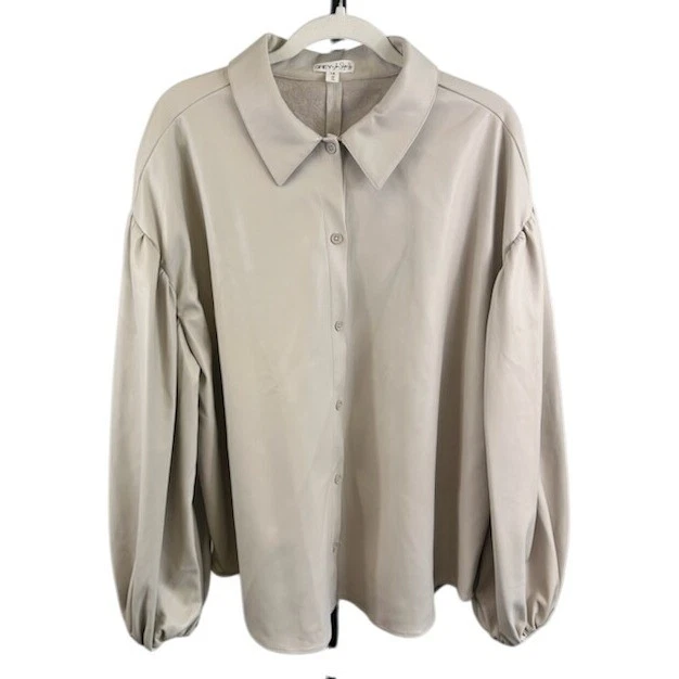Like new! Chic faux leather button-down top with a modern, oversized fit. This stylish top features a classic collared neckline and a button-down front, offering versatile styling options. The design is enhanced by long balloon sleeves, adding a touch of drama and sophistication. A comfortable inner lining ensures a smooth feel against the skin. Ideal for creating a polished casual look or a trendy evening ensemble, this top is perfect for a stylish brunch, a night out with friends, or a chic office setting.